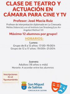 La Concejalía de Cultura del Ayuntamiento de San Miguel de Salinas presenta nuevas clases de teatro y actuación ante cámara, impartidas por José Macia Ruiz, profesor diplomado en La Cinescuela Méliès (Valencia) y en el Instituto Lee Strasberg (Los Ángeles) – Method 101.