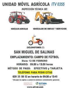 📆 El próximo día 12 de febrero, nos visitará la ITV Móvil al municipio de #SanMigueldeSalinas, para hacer inspecciones de vehículos agrícolas, vehículos de obras y servicios y ciclomotores (Excepto los sujetos a control de emisiones contaminantes gaseosas).